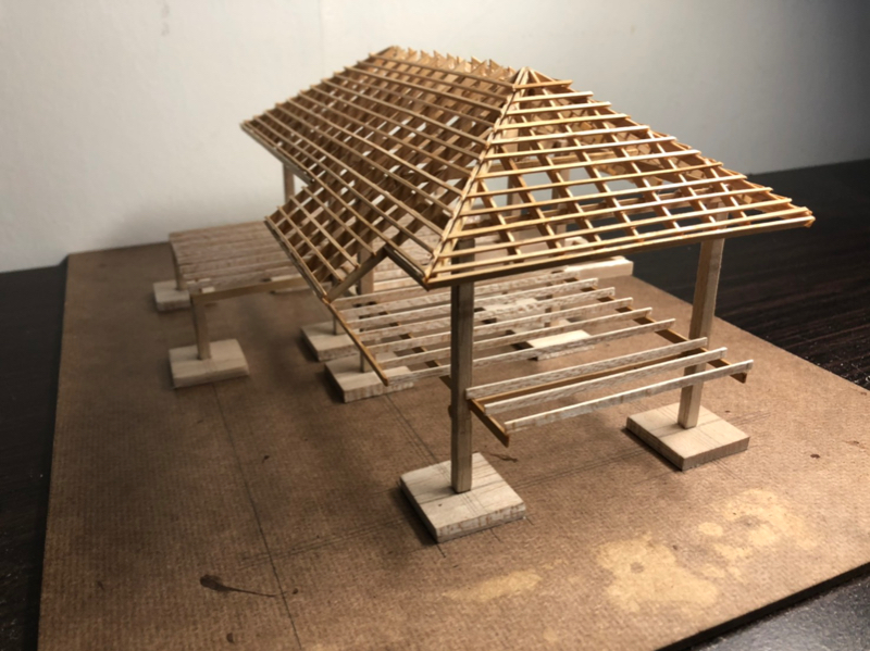 แสดงโครงสร้างไม้อาคารพักอาสัยชั้นเดียว หุ่นจำลองโครงสร้างไม้อาคารพักอาสัยชั้นเดียว ของฝาก ของที่ระลึก ของตกแต่งบ้านอาคารสำนักงาน