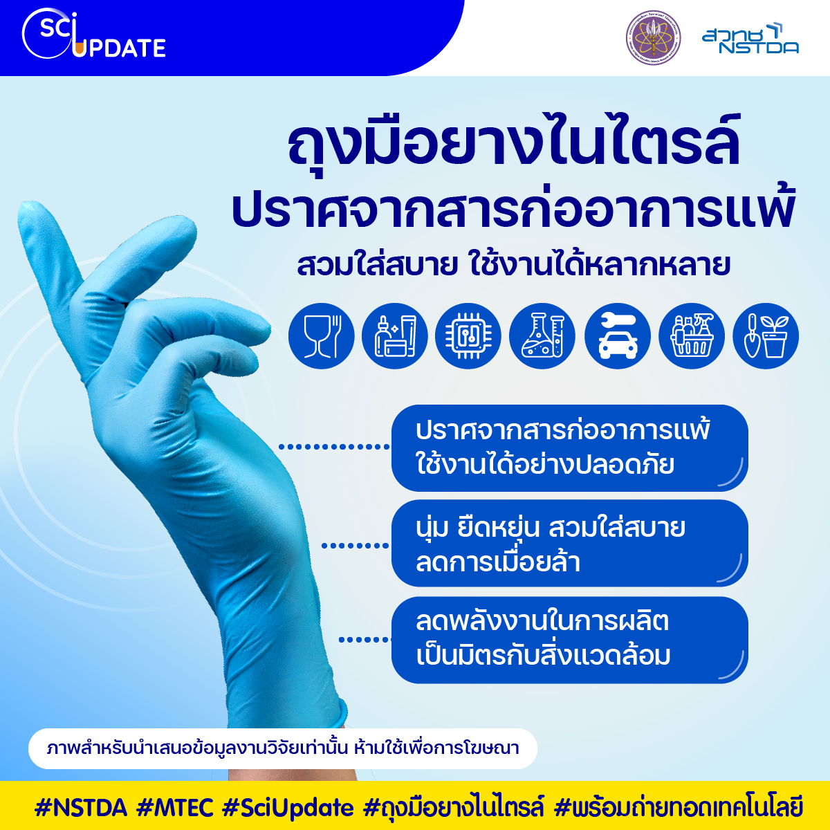 กระทรวงการอุดมศึกษา วิทยาศาสตร์ วิจัยและนวัตกรรม (อว.) โดยศูนย์เทคโนโลยีโลหะและวัสดุแห่งชาติ (เอ็มเทค) สำนักงานพัฒนาวิทยาศาสตร์และเทคโนโลยีแห่งชาติ (สวทช.) พัฒนาสูตรและกระบวนการผลิตถุงมือยางไนไตรล์ปราศจากกำมะถันและสารตัวเร่งปฏิกิริยา เพื่อเป็นทางเลือกสำหรับผู้ที่แพ้โปรตีนจากยางธรรมชาติและแพ้สารเคมีที่เป็นองค์ประกอบในถุงมือยาง ถุงมือยางไนไตรล์ที่พัฒนาขึ้นนอกจากจะทนทานต่อน้ำมันและสารเคมีแล้ว ยังนุ่มและยืดหยุ่นสูงขึ้นกว่าเดิมจึงช่วยลดอาการเมื่อยล้าจากการสวมใส่เป็นเวลานานได้อย่างดี การพัฒนาถุงมือยางชนิดนี้มุ่งเป้าตอบโจทย์การใช้งานที่ต้องการความสะอาดและปลอดภัยสูง เช่น การแพทย์ อาหาร เครื่องสำอาง อิเล็กทรอนิกส์ ยานยนต์ ห้องปฏิบัติการ รวมถึงการใช้งานทั่วไป เช่น งานทำความสะอาด ทำสวน ซ่อมรถ