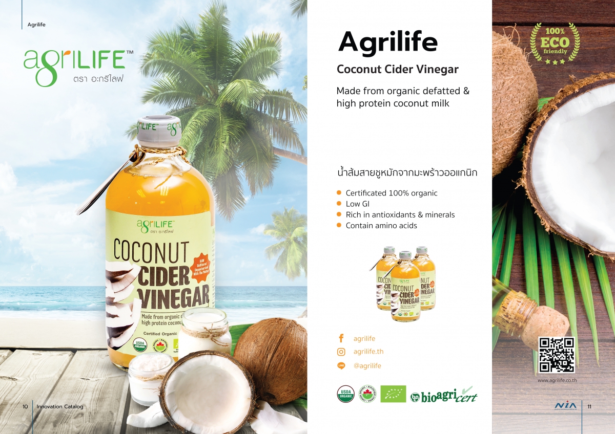 นวัตกรรมที่สร้างสรรค์จากน้ำหางกะทิไขมันต่ำ ซึ่งเป็นส่วนที่เหลือจากการสกัดน้ำมันมะพร้าวธรรมชาติ ผลิตโดย บริษัท อะกรีไลฟ์ (ประเทศไทย) จำกัด ผู้ผลิตน้ำมันมะพร้าวจากราชบุรี ต่อยอดไลน์สินค้าเพื่อมุ่งลดของเสียในโรงงานให้กลายเป็นศูนย์ (Zero Waste) ซึ่งถ้าไม่ถูกนำมาพัฒนาเป็นสินค้าก็ต้องเข้าสู่กระบวนการบำบัดน้ำเสีย ซึ่งมีค่าใช้จ่ายสูงก่อนที่จะปล่อยทิ้งได้ น้ำส้มสายชูหมักจากมะพร้าวออแกนิค Agrilife Coconut Cider Vinegar จึงถือเป็นสินค้านวัตกรรมที่ต่อยอดให้เป็นน้ำส้มสายชูหมักจากน้ำกะทิไขมันต่ำ มีสารต้านอนุมูลอิสระ มีกรดอะซีติกสูง ช่วยขจัดสารพิษ เพิ่มภูมิคุ้มกัน ควบคุมความดัน ลดคอเลสเตอรอลและไขมันในตับ ทำให้ผิวพรรณสดใส ช่วยให้การขับถ่ายดีขึ้น และยังได้รับ USDA Certified Organic นับเป็นนวัตกรรมที่ทำให้คนไทยมีสุขภาพดี เพิ่มมูลค่าของเหลือใช้ให้กลายเป็นสินค้าคุณภาพ และยังช่วยรักษาสิ่งแวดล้อมอีกด้วย