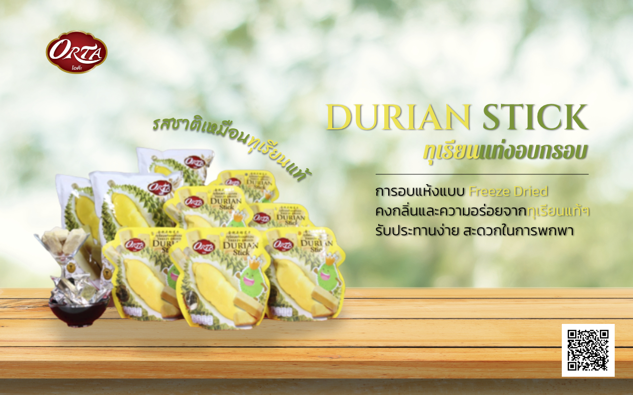 นวัตกรรมที่ช่วยเพิ่มมูลค่าสินค้าเกษตร ผลิตภัณฑ์ทุเรียนอบกรอบในรูปแบบแท่ง ทุเรียนแนวใหม่ที่ผ่านการอบแห้งแบบ Freeze Dried ที่ทำให้คงกลิ่นและความอร่อยจากทุเรียนแท้ ๆ และมีรสชาติที่สม่ำเสมอคงที่เท่ากันทุกชิ้น เป็นขนมในรูปแบบแท่ง รับประทานง่าย สะดวกในการพกพา มีความแตกต่างจากผลิตภัณฑ์ทุเรียนที่มีอยู่ในท้องตลาด และสามารถตอบสนองความต้องการของผู้ชื่นชอบทุเรียนทั้งในและต่างประเทศได้