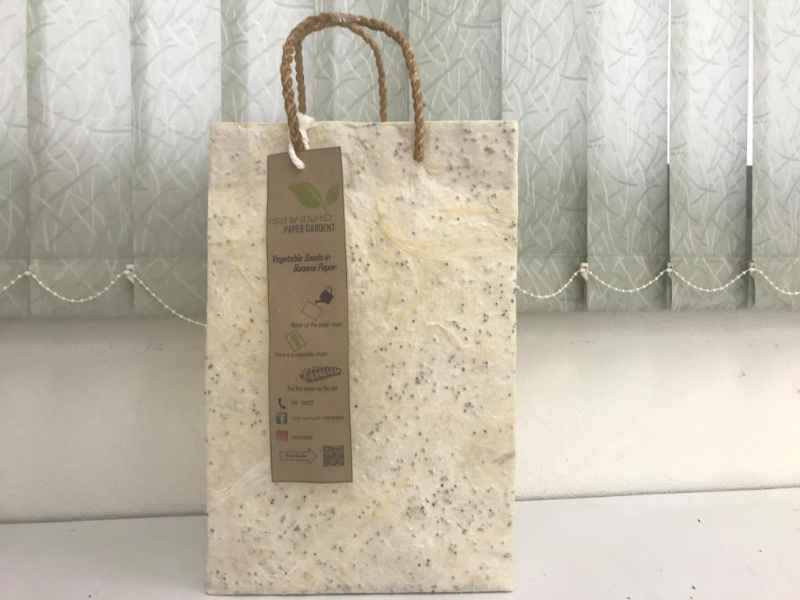 เป็นกระดาษจากใยกล้วยที่ผสมเมล็ดพันธุ์ผักสวนครัว แล้วนำมาต่อยอดเป็นผลิตภัณฑ์ถุงกระดาษที่สามารถนำไปปลูกผักได้ หลังจากการใช้งานถึงกระดาษเสร็จสิ้นแล้ว เมล็ดพันธุ์ผักที่อยู่กับกระดาษใยกล้วย มีประสิทธิภาพในการงอกดีเป็นอย่างสูง สามารถนำกระดาษไปต่อยอดเป็นผลิดภัณฑ์อื่น ๆ ได้อีกหลาหลาย และสามารถนำไปปลูกผักสวนครัวได้หลังจากการใช้งานกระดาษเป็นที่เรียบร้อยแล้ว ทำให้เกิดประโยชน์หลายด้าน