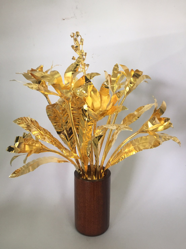 คุณสมบัติผลงาน ดอกไม้ปะดิษฐ์ทำด้วยโลหะทองแดง ชิ้นงานชุบเคลือบผิวโลหะเป็นสีทอง ด้านในดอกไม้ทุกดอกประดับด้วยหลอดไฟสร้างบรรยากาศ จัดแต่งดอกไม้เป็นพุ่มทรงดอกแจกัน กลึงด้วยท่อนไม้ต้นอินทนิน นำดอกไม้ประดิษฐ์มาจัดแต่งรูปทรงในแจกันพร้อมเปิดสวิตแสงไฟสร้างบรรยากาศจะติดขึ้นในดอกไม้ประดิษฐ์ ประสิทธิภาพ ใช้สำหรับตกแต่งพื้นที่ในที่ร่ม เพื่อให้บรรยากาศในพื้นที่ที่จัดวางมีความสวยงาม แสงไฟสร้างบรรยากาศช่วยเพิ่มความรู้สึกผ่อนคลาย ใช้ประดับตกแต่งพื้นที่ที่จัดตั้งจัดวางในห้องในที่ร่ม เพื่อเพิ่มความสวยงามในพื้นที่ แจกันดอกไม้ประดิษฐ์ในรูปแบบไฟสร้างบรรยากาศสามารคเปิดแสงไฟสร้างบรรยากาศได้ ให้ความรู้สึกผ่อนคลายแก่ผู้พบเห็น