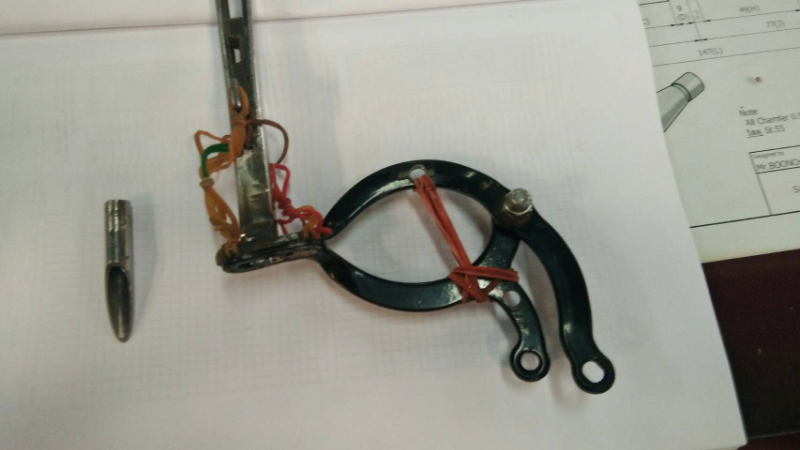 ตัวโครงผลิตจากเหล็กไร้สนิม และด้ามหนีบทำจากก้ามเบรกจักรยาน เข็มแทงทำจากเหล็กไร้สนิม เหล็กกระทุ้งเข็มแทงทำจากเหล็ก และแรงกระทุ้งใช้จากหนังยาง หลักการทำงานของอุปกรณ์สนตะพายวัวจะใช้แรงกระทุ้งเข็มแทงจากให้ทะลุผ่านผนังกั้นจมูกของวัว หลังจากนั้นจึงใช้เชือกร้อยผ่านรูของเข็มแทง แล้วจึงดึงเข็มแทงออกทางเดิม ซึ่งการกระทุ้งเข็มแทงทำได้รวดเร็วทำให้ง่ายต่อการสนตะพายวัว โดยการกระทุ้งเข็มแทง 2-3 ครั้ง ต่อการสนตะพายวัว 1 ตัว ช่วยให้การกระทุ้งแทงผนังจมูกของวัวในการสนตะพายวัวเร็วขึ้น