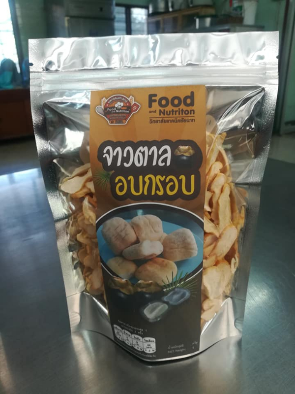 จาวตาลอบกรอบ โดยการศึกษากระบวนการผลิตจาวตาลอบกรอบ จาวตาลสดหั่นแผ่นบางอบจนกรอบ เป็นของรับประทานเล่น สร้างผลิตภัณฑ์ใหม่ ช่วยให้อุตสาหกรรมอาหารมีการพัฒนาขึ้น หากมีการต่อยอดอาจจะนำไปประยุกต์กับอาหารได้อีกหลายชนิดจาวตาลมีฟอสฟอรัสสูง จึงช่วยเสริมสร้างกระดูกและฟันให้แข็งแรง