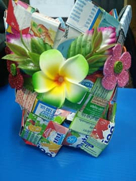 เป็นภาชนะที่สานด้วยกล่องนม ให้มีรูปทรงต่าง ๆ ตามต้องการ ใช้สำหรับ ใส่สิ่งของต่าง ๆ ในห้องพัก บ้านเรือน ฯลฯ