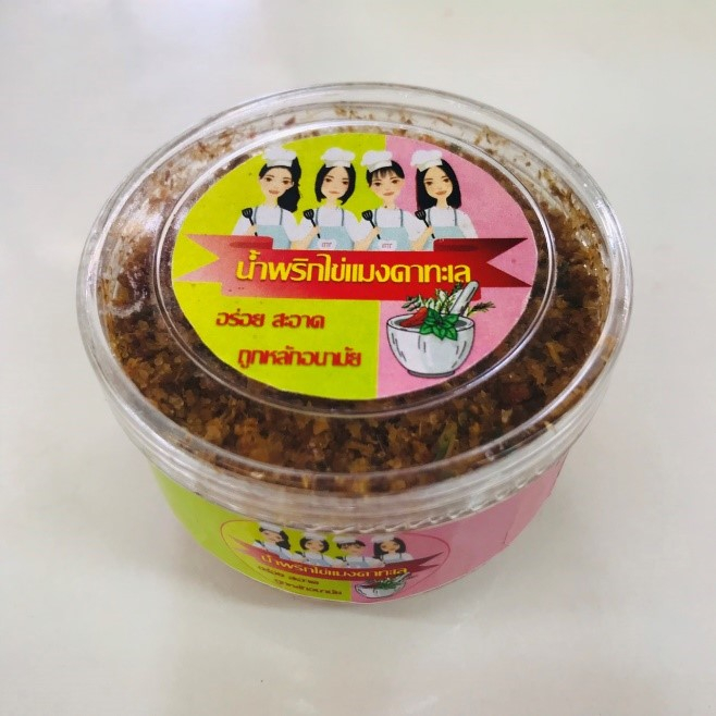 ผลิตภัณฑ์อาหารสำเร็จรูป น้ำพริกไข่แมงดาทะเล รับประทานกับข้าวสวยและผัก ได้รสชาติที่อร่อยและอุดมด้วยคุณประโยชน์ที่ถูกปาก จำหน่ายในราคากระปุกละ 35 บาท ราคาแพค 3 กระปุก 100 บาท การทำน้ำพริกไข่แมงดาทะเลเป็นการผลิตน้ำพริกในรูปแบบผลิตภัณฑ์ใหม่ให้เข้ากับความต้องการของผู้บริโภคและนำวัตถุดิบที่มีในท้องถิ่น คือแมงดาทะเล ในเขตทะเลพุมเรียง อ.ไชยา จ.สุราษฎร์ธานี ซึ่งเป็นวัตถุดิบที่เต็มไปด้วยคุณค่าทางโภชนาการมาแปรรูปเป็นผลิตภัณฑ์น้ำพริกที่สามารถหารับประทานได้ง่าย