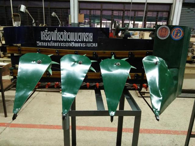 เมื่อมีปัญหาการขาดแคลนแรงงานเกี่ยวข้าวเกิดขึ้น รถเกี่ยวข้าวจึงเป็นเครื่องทุ่นแรงที่ดี แต่รถเกี่ยวข้าวที่สั่งซื้อจากต่างประเทศ ไม่สามารถนำมาใช้กับสภาพพื้นที่นาของประเทศเราได้ คณะผู้วิจัยจึงทดลองประดิษฐ์รถเกี่ยวข้าวขึ้น เพื่อให้เหมาะสมกับสภาพการใช้งานของเมืองไทย โดยคัดเลือกชิ้นส่วนจากรถเกี่ยวนวดข้าว และปรับระบบการขับเคลื่อนจากเดินตามเป็นระบบนั่งขับ ซึ่งทำให้ผู้ใช้งานไม่ต้องออกแรงมาก รถเกี่ยวข้าวแบบวางรายจึงมีความเหมาะสมกับการใช้งานและทันสมัยมากขึ้น พร้อมทั้งลงทุนผลิตรถเกี่ยวข้าวไว้ใช้เอง รวมทั้งผลิตเพื่อการจำหน่ายด้วย