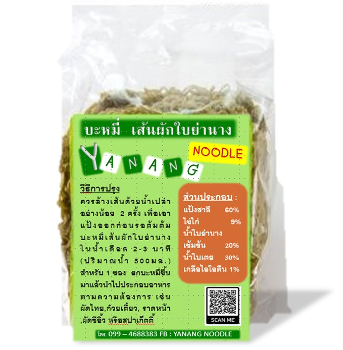 งานวิจัยการพัฒนาบะหมี่เส้นผักใบย่านาง มีวัตถุประสงค์เพื่อพัฒนาผลิตภัณฑ์บะหมี่เส้นผักใบย่านาง โดยศึกษาการใส่ใบย่านางในรูปแบบน้ำใบย่านางผสมน้ำใบเตยลงในส่วนผสมของบะหมี่ในปริมาณเข้มข้นแตกต่างกัน 3 ระดับ คือ ร้อยละ 20, 30 และ 40 ของน้ำหนักส่วนผสม จากการทดสอบคุณภาพทางกายภาพของบะหมี่เส้นผักใบย่านาง โดยการเปรียบเทียบสีของบะหมี่ และเปรียบเทียบความต้านทานต่อการดึงขาดของบะหมี่ พบว่า เมื่อปริมาณความเข้มข้นของน้ำใบย่านางผสมใบเตยเพิ่มขึ้นความต้านทานการดึงขาดลดลง และการทดสอบคุณภาพทางประสาทสัมผัสด้านความชอบ ด้วยวิธี 5 point hedonic scale พบว่า เส้นบะหมี่ที่ใส่น้ำใบย่านางผสมใบเตยที่ความเข้มข้นร้อยละ 30 มีคะแนนความชอบมากที่สุด