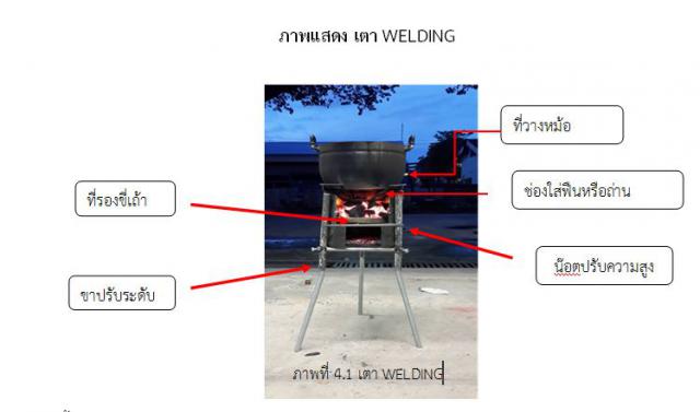 ผลการศึกษาวิจัยเรื่องเตา Welding พบว่าที่เวลา 0, 5, 10, 15 และ 20 นาที อุณหภูมิของน้ำในหม้อทั้ง 3 ขนาดที่ต้มด้วยเตา Welding มีการเพิ่มเร็วกว่าเตาอั้งโล่ธรรมดาเล็กน้อย การเก็บความร้อนมีค่าใกล้เคียงกัน ผลต่างอุณหภูมิของน้ำที่ต้มด้วยเตา Welding กับเตาอั้งโล่ธรรมดา โดยใช้หม้อที่มี Ø 20, 25 และ 32 ซม. = 2.17, 2.66, 1.66 ตามลำดับ ผลของระดับความพึงพอใจของกลุ่มตัวอย่างที่ใช้ เตา Welding ด้านส่วนประกอบทั่วไปของ เตา พบว่าผู้ใช้เตา Welding มีความพึงพอใจด้านส่วนประกอบทั่วไปของของเตาอยู่ในระดับ มาก มีค่าเฉลี่ย ( ) = 4.1 มีค่าเบี่ยงเบนมาตรฐาน (SD) = 0.57 3 ผลการศึกษาความพึงพอใจของผู้ใช้ เตา Welding ต่อส่วนของเตา พบว่า ความพึงพอใจของกลุ่มตัวอย่างที่ทดลองใช้เตา Welding มีความพึงพอใจต่อส่วนของเตาอยู่ในระดับมากมีค่าเฉลี่ย ( ) = 4.1มีค่าเบี่ยงเบนมาตรฐาน (SD) =0.77