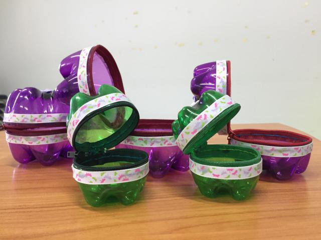 กระเป๋าเอนกประสงค์จากขวดน้ำพลาสติก มีลักษณะเป็นทรงกลม มีซิปรูด และตกแต่งด้วยริบบิ้น กระเป๋าเอนกประสงค์จากขวดน้ำพลาสติก มีประโยชน์สำหรับใส่ของ ใส่เหรียญ หรือใส่เครื่องประดับ