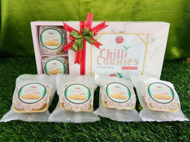 เป็นผลิตภัณฑ์คุกกี้ที่มีส่วนผสมของสารสกัดจากพริกขี้หนู มีสีน้ำตาลทอง มีกลิ่นหอมเนย มีความกรอบ มีเนื้อขนมนุ่มนวล มีรสสัมผัสจากกุ้งแห้ง และมีความเผ็ดเล็กน้อย คุกกี้หนักชิ้นละ 10 กรัม บรรจุ 3 ชิ้น ต่อ 1 ซองเล็ก และบรรจุ 6 ซองต่อ 1 กล่อง น้ำหนักสุทธิ 340 กรัม ผลิตภัณฑ์คุกกี้พริกขี้หนูใช้รับประทานเป็นของว่าง เพิ่มรสชาติเผ็ดเล็กน้อยจากสารสกัดพริกขี้หนูสด มีแคลอรี่ • 78 ต่อ 1 ชิ้น โปรตีน • 34%, คาร์โบไฮเดรต 70.35%, ไขมัน 20.10% และ ใยอาหาร 0.21% มีสารแคปไซซินจากสารสกัดที่ช่วยต่อต้านสารอนุมูลอิสระ ลดคอเลสเตอรอล ช่วยระบบน้ำย่อยอาหาร กระตุ้นการหมุนเวียนโลหิตในร่างกาย และมีสารคลอโลฟิลล์ที่ช่วยต้านสารพิษที่ก่อให้เกิดมะเร็ง ขับสารพิษในเลือด