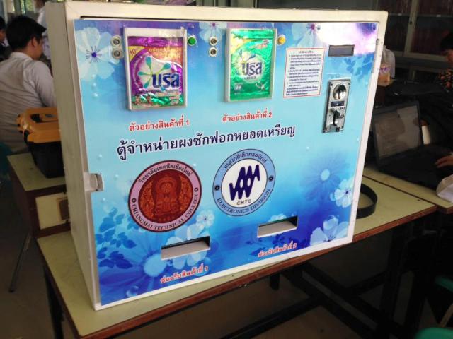 วิจัยเรื่อง“ตู้จำหน่ายผงซักหยอดเหรียญ”ปัจจุบันคนไทยมีวิถีชีวิตมีการเปลี่ยนแปลงไปและในอนาคตการเปลี่ยนแปลงนี้ยังดำเนินไปเรื่อยๆ ในทิศทางที่ไม่แน่นอน เทคโนโลยีได้เป็นที่สนใจของคนไทย เทคโนโลยีจึงเป็นที่แพร่หลายและนำมาใช้ในการทำงานและชีวิตประจำวัน รวมไปถึงผู้ที่อาศัยอยู่หอพัก บ้านพักที่ทำงาน ได้ใช้บริการเครื่องซักผ้าหยอดเหรียญหอพักหรือสถานที่ต่างๆ แต่ก็ยังจะต้องเตรียมจัดหาผงซักฟอกไปใส่เครื่องซักผ้าเองด้วยการออกไปหาซื้อที่ห่างไกลจากเครื่องซักผ้าการจัดหาผงซักฟอกนั้นเป็นอุปสรรคในการซักผ้าในแต่ละครั้ง ซึ่งต้องไปหาซื้อที่ร้านค้า ซึ่งบางทีห่างไกลจากเครื่องซักผ้า ผู้จัดทำจึงคิดค้นตู้จำหน่ายผงซักฟอกหยอดเหรียญเพื่อให้ความสะดวกสบายแก่ผู้ที่มาใช้บริการจะซักผ้า โดยสามารถซื้อผงซักฟอกผ่านตู้จำหน่ายผงซักฟอกหยอดเหรียญได้รวดเร็วและสะดวกสบายมากขึ้น