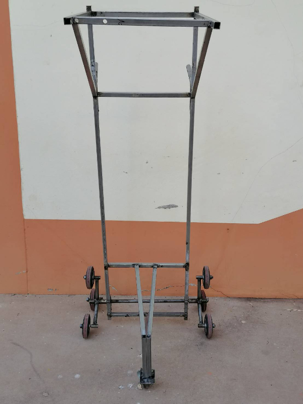 รถเข็นเก้าอี้พลาสติกขึ้นบันได ทำขึ้นจากเหล็กกล่องขนาด 1/2 นิ้ว และประกอบด้วยล้อข้างละสามล้อ ซึ่งทำให้สามารถไต่บันไดได้ ทำให้ง่ายแก่การขนย้ายเก้าอี้ขึ้นลงชั้นบนครั้งมากๆ ทั้งยังประหยัดแรงงานคนในการขนย้าย