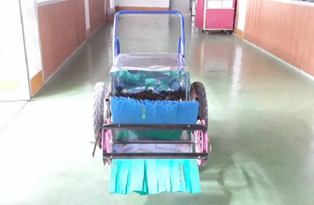 รถเก็บใบไม้ จะประกอบไปด้วยรถเข็นทำหน้าที่เข็นตัวรถให้เคลื่อนที่ไปยังบริเวณที่ต้องการเก็บขยะ และจะส่งกำลังด้วยโซ่จากล้อของรถเข็นไปขับเคลื่อนชุดกวาดเก็บใบไม้ซึ่งอยู่ด้านหน้า โดยเมื่อเข็นรถให้เคลื่อนที่ ชุดเก็บใบไม้ก็จะหมุนเพื่อทำการกวาดใบไม้ไปด้วย และส่วนสุดท้ายเป็นส่วนของชุดเก็บใบไม้โดยใบไม้จะถูกเก็บไว้ในตัวรถซึ่งเมื่อเก็บใบไม้จนหมดแล้วสามารถที่จะยกชุดเก็บใบไม้เพื่อนำใบไม้ที่ได้ไปจัดทำปุ๋ยต่อไป 1สามารถลดเวลาในการจัดเก็บใบไม้ 2สามารถลดกำลังคนในการจัดเก็บใบไม้ 3อำนวยความสะดวกในการจัดเก็บใบไม้ 4ทำให้อาคารสถานที่สะอาดเรียบร้อยเนื่องจากมี่เศษใบไม้ล่วงในพื้นที่