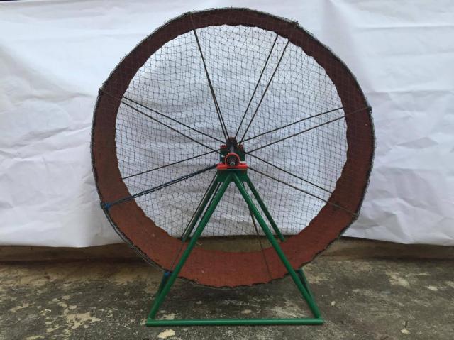 วงล้อออกกำลังกายไก่ชน เป็นวงล้อมีขนาดเส้นรอบวง 4 เมตร มีเส้นผ่านศูนย์กลาง 120 ซม. ขนาดของฐานยาว 80 ซม. กว้าง 50 ซม. ขนาดความสูงของวงล้อ 135 ซม. น้ำหนัก 30 กิโลกรัม มีช่องประตูเปิดสำหรับใส่ไก่ชน ใช้แบริ่ง 2 ตัว ขนาด 6 หุล เป็นตัวหมุน มีเพลากลางขนาด 6 หุล ยาว 60 ซม. เป็นแกนหมุน ใช้พรมปูพื้นในวงล้อเพื่อรองรับการวิ่งของไก่ชน ใช้ออกกำลังกายไก่ชนโดยให้ไก่วิ่ง แทนการออกกำลังกายโดยใช้คน ลดอาการปวดเมื่อย เนื่องจากต้องออกกำลังกายไก่ชน ประหยัดเวลา สามารถปล่อยให้ไก่วิ่งเองได้