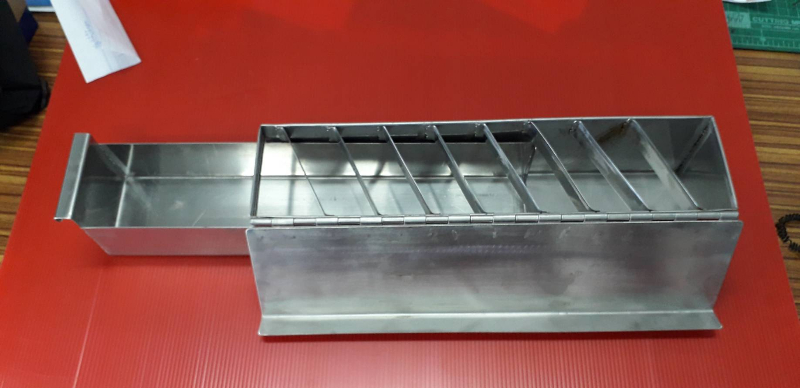ลักษณะของชิ้นงาน เป็นกล่องหั่นไส้กรอกที่ทำจากโลหะสแตนเลส มีใบมีดสำหรับหั่นใส่กรอกชิ้นละ