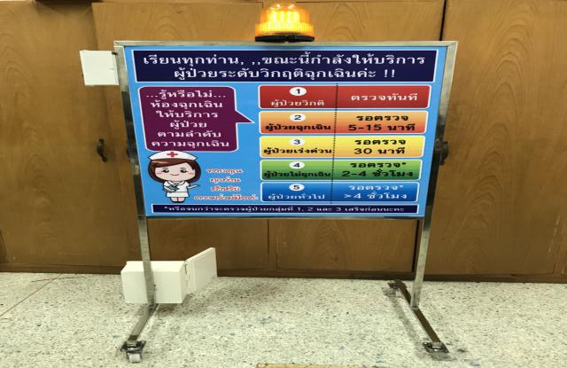 จากปัญหาเกิดการร้องเรียนแพทย์และพยาบาลวิชาชีพประจำห้องฉุกเฉินจากผู้มารับบริการเนื่องจากผู้มารับบริการในห้องฉุกเฉินส่วนใหญ่มักจะคิดว่าตัวเองป่วยในภาวะฉุกเฉินและไม่สามารถรอคอยได้เป็นเหตุให้ผู้ที่รออยู่ข้างนอกไม่ทราบว่าข้างในกำลังทำอะไรอยู่หรือให้บริการอะไรอยู่ที่สุดแล้วก็เป็นความไม่พึงพอใจและเกิดเป็นเรื่องร้องเรียนขึ้น ผู้จัดทำจึงได้คิดสิ่งประดิษฐ์ อุปกรณ์ไฟแจ้งเตือนหน้าห้องฉุกเฉิน เพื่อประชาสัมพันธ์ว่าผู้ป่วยที่จะเข้าใช้ห้องฉุกเฉินนั้นมีกี่ประเภทโดยใช้แถบสีและข้อความเป็นตัวสื่อสารและมีสัญญาณไฟฉุกเฉินซึ่งจะมีลักษณะเป็นไฟหมุนคล้ายคลึงกับไฟสัญญาณของรถพยาบาลแต่ไม่มีเสียงเพื่อแสดงให้ผู้มารอเห็นว่าขณะนี้ห้องฉุกเฉินกำลังใช้งานอยู่โดยภายในห้องนั้นเป็นคนไข้ในภาวะวิกฤตชีวิต