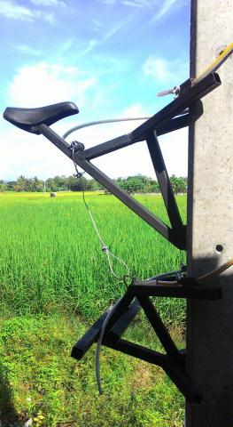 อุปกรณ์ช่วยปีนเสาไฟฟ้า สะดวกใช้ ช่วยในการปีนเสาไฟฟ้าที่เป็นเสาคอนกรีตหรือเสาไม้ก็ได้ แบ่งออกเป็น 2 ส่วนคือส่วนสำหรับนั่งปฏิบัติงาน และส่วนสำหรับวางเท้า โดยในส่วนที่ 1 นั้นจะมีลวดสลิงร้อยท่อยางป้องกันลื่นไว้สำหรับคล้องส่วนที่หนึ่งติดกับเสาไฟฟ้า สามารถปรับระยะห่างได้ตามสะดวก ส่วนที่ 2 สำหรับวางเท้าและมีลวดสลิงร้อยท่อยางป้องกันลื่นสำหรับคล้องติดกับเสาไฟฟ้า และจะเชื่อมต่อมากับส่วนที่หนึ่งคือมีลวดสลิงร้อยท่อยางมัดผูกส่วนที่หนึ่งให้ติดกับส่วนที่สอง โดยทั้งสองส่วนนี้จะมีลักษณะเด่นคือหน้าแปลนสำหรับยันกับเสาไฟฟ้าไว้ อีกทั้งยังสามารถหมุนได้ 360 องศา