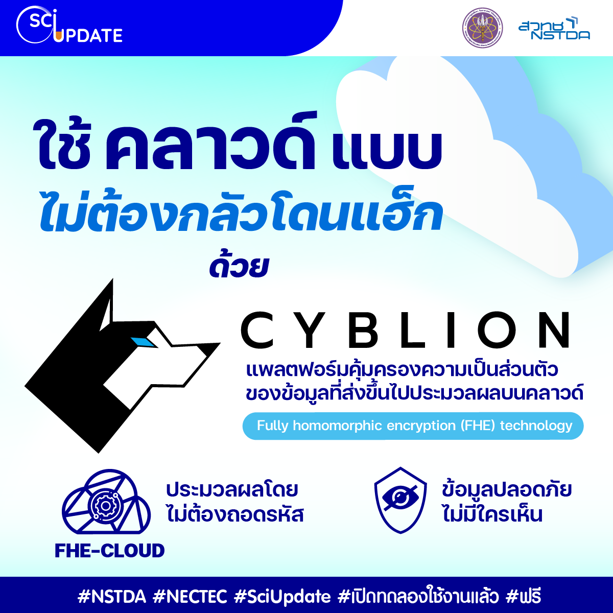 กระทรวงการอุดมศึกษา วิทยาศาสตร์ วิจัยและนวัตกรรม (อว.) โดยศูนย์เทคโนโลยีอิเล็กทรอนิกส์และคอมพิวเตอร์แห่งชาติ (เนคเทค) สำนักงานพัฒนาวิทยาศาสตร์และเทคโนโลยีแห่งชาติ (สวทช.) พัฒนา ‘CYBLION (ไซบีเลียน)’ แพลตฟอร์มคุ้มครองความเป็นส่วนตัวของข้อมูลที่ส่งขึ้นไปประมวลผลบนคลาวด์ ด้วยเทคโนโลยี Fully Homomorphic Encryption (FHE) เพื่อให้คลาวด์ประมวลผลข้อมูลได้โดยไม่ต้องถอดรหัส ปิดช่องโหว่ความปลอดภัยของเทคโนโลยีการประมวลผลที่ใช้งานอยู่ทั่วไปในปัจจุบัน ทั้งนี้การวิจัยและพัฒนาได้รับทุนสนับสนุนจากกองทุนวิจัยและพัฒนากิจการกระจายเสียง กิจการโทรทัศน์ และกิจการโทรคมนาคม เพื่อประโยชน์สาธารณะ (กทปส.) สำนักงานคณะกรรมการกิจการกระจายเสียง กิจการโทรทัศน์ และกิจการโทรคมนาคมแห่งชาติ (กสทช.)