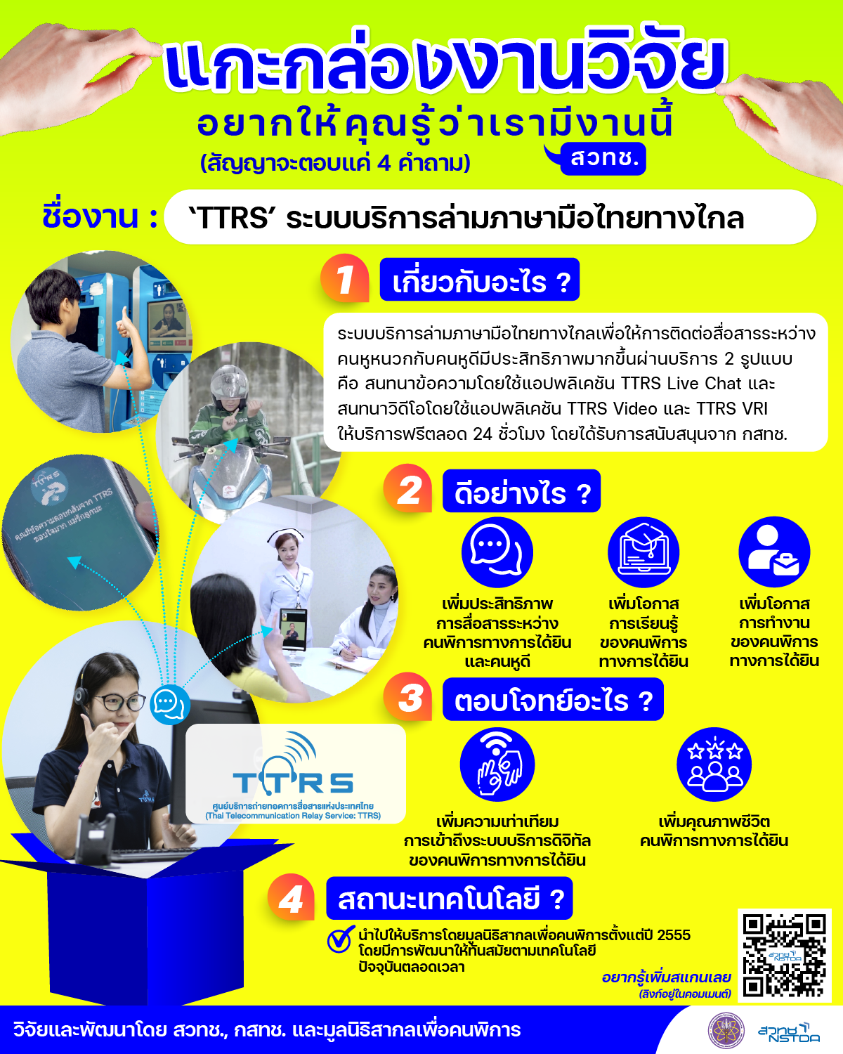 รายละเอียดเพิ่มเติมเกี่ยวกับงานวิจัย : สวทช. ร่วมพันธมิตร พัฒนาเทคโนโลยีสนับสนุน ‘คนพิการและผู้สูงอายุเข้าถึงบริการดิจิทัลอย่างเท่าเทียม (Digital inclusion)’