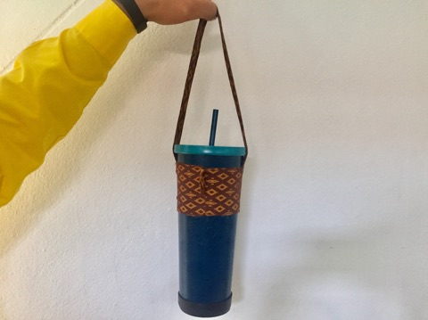 เป็นถุงใส่แก้วน้ำที่ทำมาจากวัสดุที่เหลือใช้นั้นคือเศษผ้า ถุงผ้าใส่แก้วน้ำมีสีสรรค์ ลวดลายสวยงาม สามารถใช้ใส่แก้วน้ำดื่มแทนการใช้ถุงพลาสติก ซึ่งเป็นการรณรงค์การลดการใช้ถุงพลาสติก อีกทั้งยังเป็นการรักษาสิ่งแวดล้อมและสามารถช่วยลดสภาวโลกร้อนอีกวิธีการนึง ถุงผ้าใส่แก้วน้ำสามารถใช้ใส่แก้วน้ำแทนการใช้ถุงพลาสติก