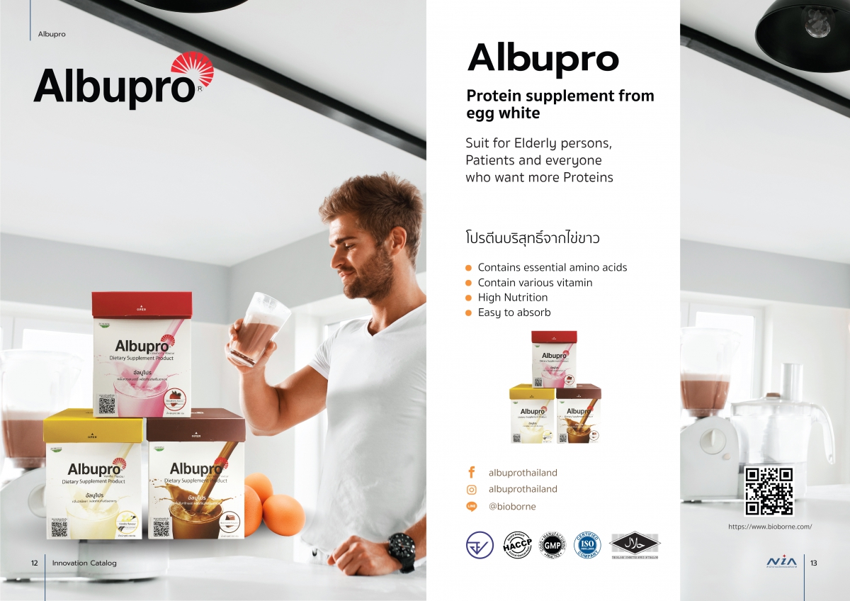 Albupro เป็นนวัตกรรมที่นำไข่ขาวมาผ่านกระบวนการสกัดด้วยน้ำบริสุทธิ์ร่วมกับกระบวนการปั่นแยกในสภาวะที่เหมาะสม ซึ่งจะทำให้ได้โปรตีนอัลบูมิน (albumin) สกัดที่มีความปลอดภัยและมีคุณค่าสูง ก่อนนำไปพัฒนาเป็นผลิตภัณฑ์อาหารเสริมที่สะดวกต่อการรับประทาน โดยมีปริมาณโปรตีนสูงเทียบเท่ากับการรับประทานไข่ไก่ 4 ฟอง ซึ่งจะช่วยเพิ่มภูมิคุ้มกันให้แก่ร่างกายสำหรับผู้ป่วยและผู้ขาดสารอาหารที่มีภาวะทุพโภชนาการ ผลิตภัณฑ์ดังกล่าวมีศักยภาพในการพัฒนาให้เป็นผลิตภัณฑ์อาหารเสริมที่ช่วยเพิ่มระดับโปรตีนในเลือด ซึ่งจำเป็นสำหรับผู้ป่วยที่ต้องการเพิ่มภูมิคุ้มกัน เช่น ผู้ป่วย HIV ผู้ป่วยที่ได้รับคีโม ผู้ป่วยไตวายระยะสุดท้าย หรือผู้ขาดสารอาหารที่มีภาวะทุพโภชนาการ เป็นต้น และช่วยให้ผู้บริโภคมีภูมิคุ้มกันและมีสุขภาพที่แข็งแรง ช่วยลดอัตราการเจ็บป่วยและการสูญเสียค่าใช้จ่ายในการรักษาพยาบาล ในด้านเศรษฐกิจยังช่วยลดปริมาณการนำเข้าผลิตภัณฑ์อาหารเสริมจากต่างประเทศ และยังก่อให้เกิดการลงทุนในธุรกิจใหม่ และทำให้มีการจ้างงานเพิ่มมากขึ้น