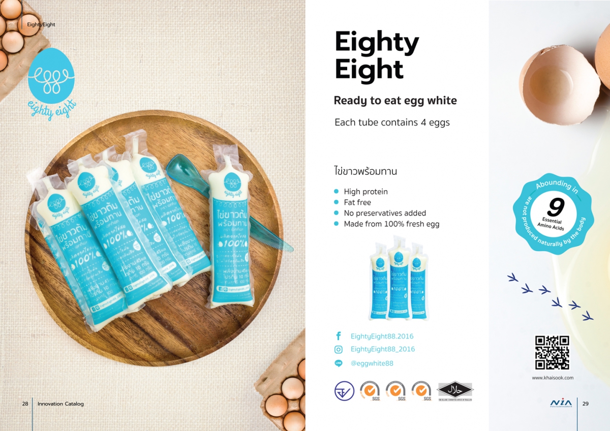 นวัตกรรมอาหารเพื่อสุขภาพที่ให้ชีวิตสะดวกสบายยิ่งขึ้น ผลิตภัณฑ์ไข่ขาวต้มพร้อมรับประทานที่คิดค้นกระบวนการอัดไข่ขาวสดจากธรรมชาติ 100% จำนวน 4 ฟอง ลงไปในบรรจุภัณฑ์แบบแท่งคล้ายเต้าหู้ เพื่อให้เนื้อไข่ขาวแน่น เนียน ไม่มีฟองอากาศ และสามารถเก็บไว้ในตู้เย็นหลังจากผลิตได้นานถึง 45 วัน โดยไม่ใส่สารกันบูด สะดวก ปลอดภัย รับประทานได้ทันที หรือนำไปปรุงเป็นอาหารทั้งคาวและหวานได้หลากหลายเมนู มีโปรตีนและกรดอะมิโนสูง ตอบโจทย์คนรักสุขภาพ ผู้ป่วยโรคไต และผู้ออกกำลังกายที่เน้นการสร้างกล้ามเนื้อ