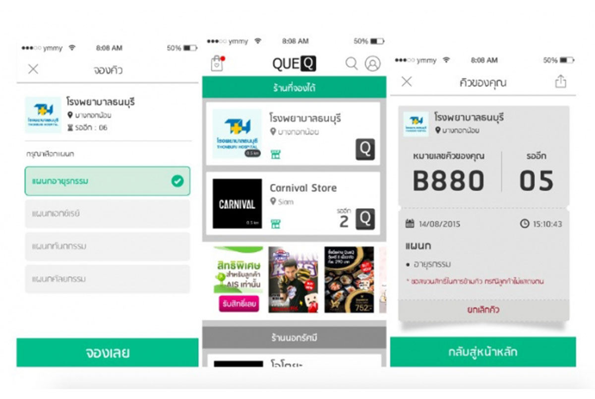 แอพพลิเคชั่นสำหรับบริหารจัดการคิวรับบริการที่โรงพยาบาลที่ทำให้ชีวิตยุคใหม่ง่ายและสะดวกขึ้น โดยสามารถจองและจัดคิวผ่านสมาร์ตโฟน ระบบจะประมวลผลและจัดคิวให้ผู้รับบริการอัตโนมัติ ช่วยให้เข้ารับบริการได้รวดเร็ว ใช้เวลาอยู่ในโรงพยาบาลน้อยที่สุด ผู้รับบริการสามารถทราบเวลาในแต่ละจุด ช่วยลดเวลาให้กับคนไข้และญาติได้หลายชั่วโมง โรงพยาบาลสามารถตรวจสอบและแก้ไขจุดที่มีปัญหาติดขัดได้ทันสถานการณ์ จึงเป็นนวัตกรรมที่มีประโยชน์ต่อสังคมในวงกว้าง