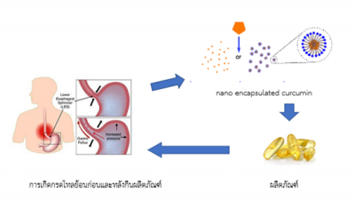 ในปัจจุบันโรคกรดไหลย้อน (Gastroesophageal reflux disease: GERD) เป็นโรคที่เกิดจากภาวะที่มีการไหลย้อนกลับของน้ำย่อยหรือสิ่งที่อยู่ในกระเพาะอาหารกลับขึ้นมาที่หลอดอาหาร พบได้ตั้งแต่เด็กทารกไปจนถึงผู้ใหญ่ อาจทำให้เกิดอาการแสบร้อนบริเวณหน้าอกหรืออาการขย้อนจนรบกวนการใช้ชีวิตประจำวันได้ ซึ่งการอักเสบอาจทำให้เซลล์เยื่อบุหลอดอาหารเปลี่ยนแปลงและเสี่ยงต่อการเกิดมะเร็งได้ ซึ่งปัจจุบันนั้นได้มีการนำสารสกัดจากสมุนไพรชนิดต่าง ๆ ที่มีสรรพคุณเฉพาะตัวมาพัฒนาเป็นผลิตภัณฑ์เสริมอาหารหลายรูปแบบที่ช่วยบรรเทาอาการกรดไหลย้อนได้ เช่น สารสกัดจากขมิ้นชันที่มีสารกลุ่มเคอร์คิวมินนอยด์ (curcuminoids) ซึ่งมีสรรพคุณ ช่วยเจริญอาหาร แก้ท้องอืดท้องเฟ้อ แน่น จุกเสียด ลดน้ำหนัก เป็นต้น แต่เนื่องปัญหาที่พบคือสารสกัดกลุ่มเคอร์คิวมินนอยด์ (curcuminoids) นั้นมีการดูดซึมได้ไม่เต็มที่ ไม่มีความเสถียน และมีการละลายน้ำที่ต่ำ จึงได้มาการพัฒนาโดยใช้เทคโนโลยีนาโนเอนแคปซูเลชัน (nanoencapsulation) เข้ามาช่วยเพิ่มการสร้างความเสถียนภาพ เพิ่มการดูดซึมให้ได้มากยิ่งขึ้น